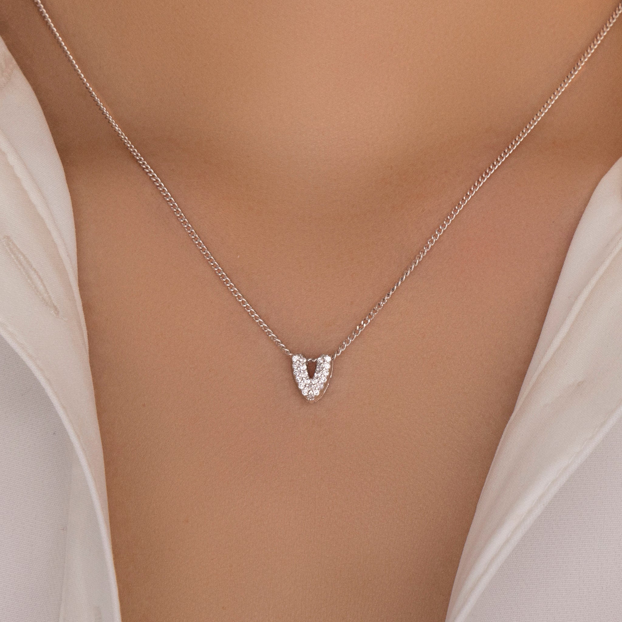 Mini Silver Crystal Letter Necklace (V)