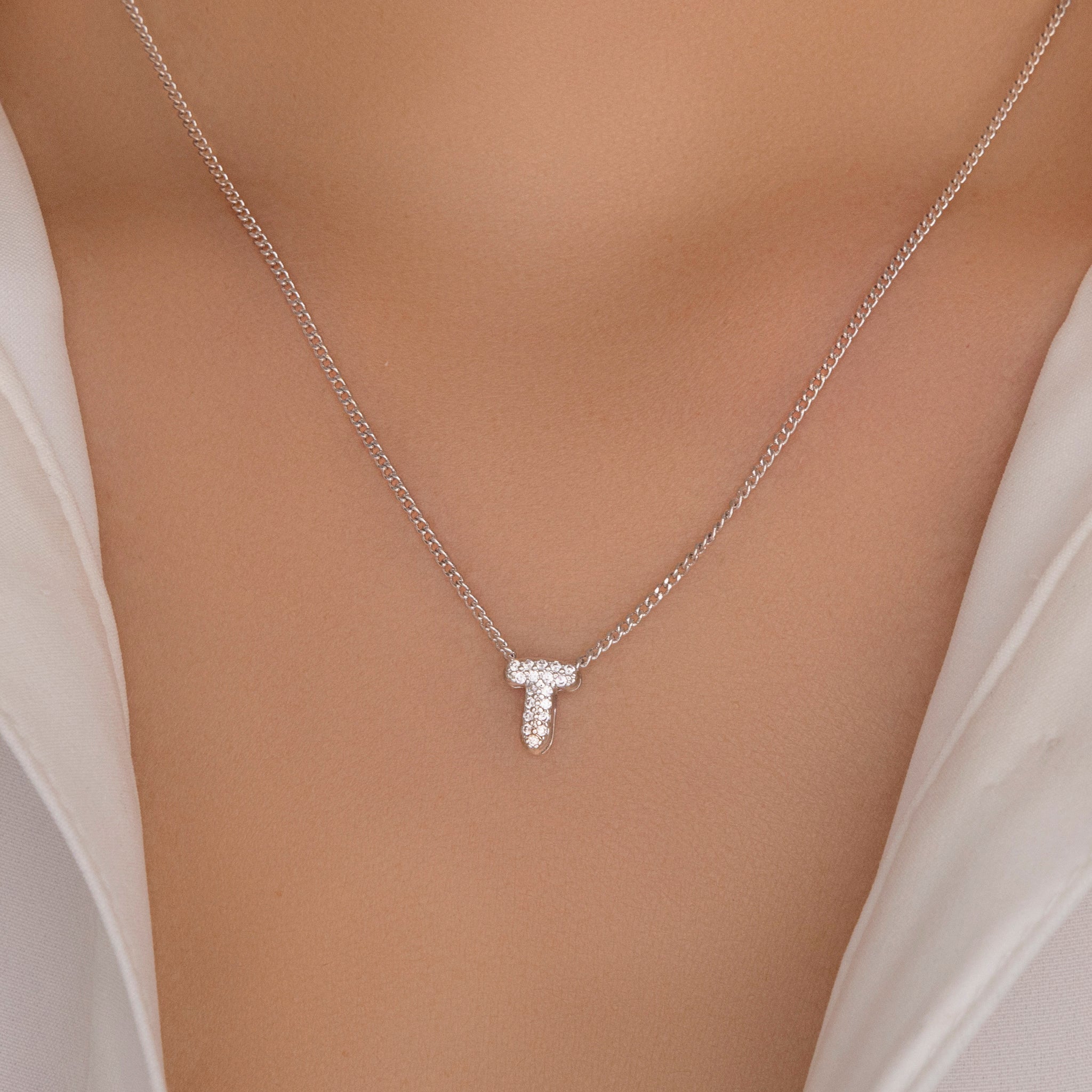 Mini Silver Crystal Letter Necklace (T)