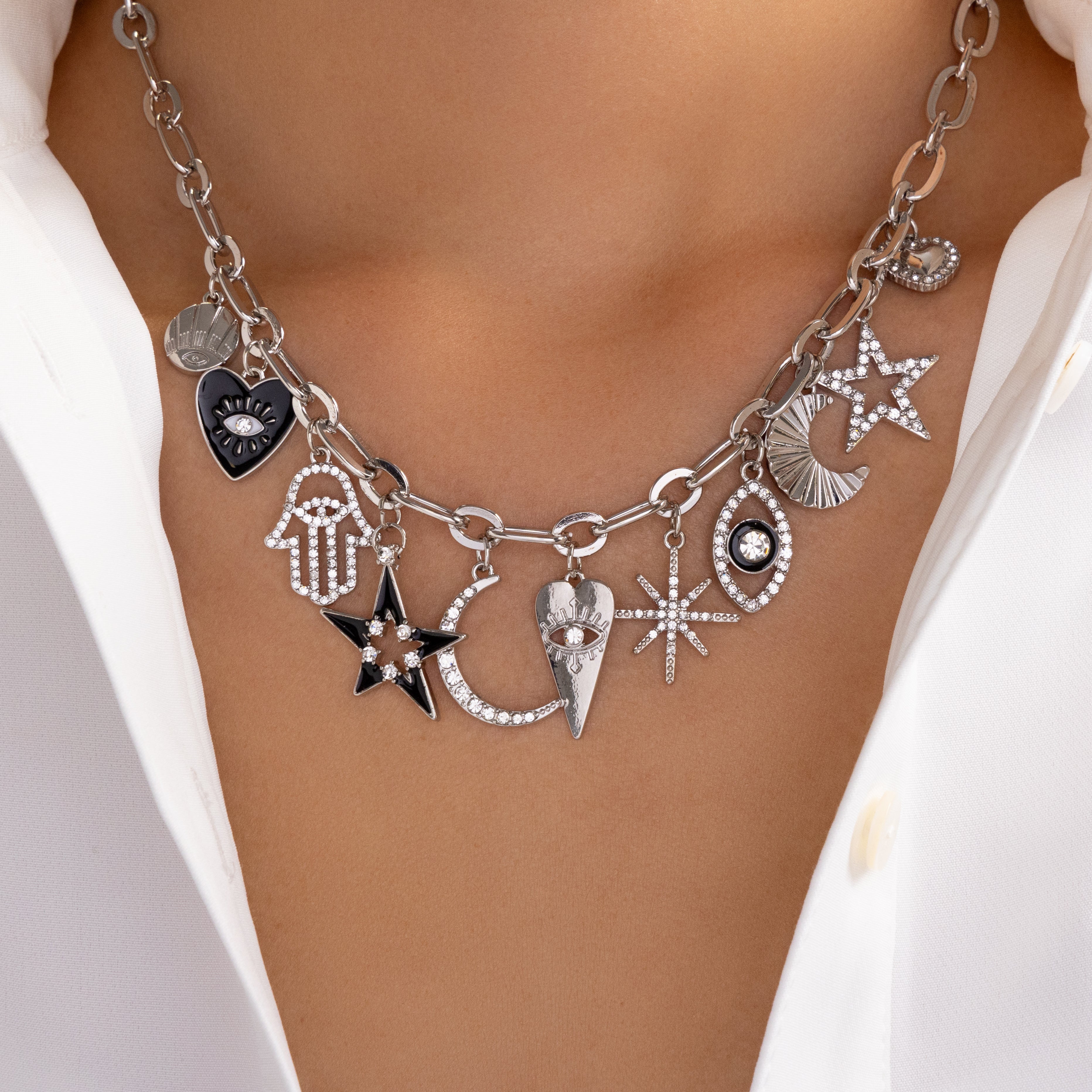 Hamsa & Eye Charm Necklace (Silver)
