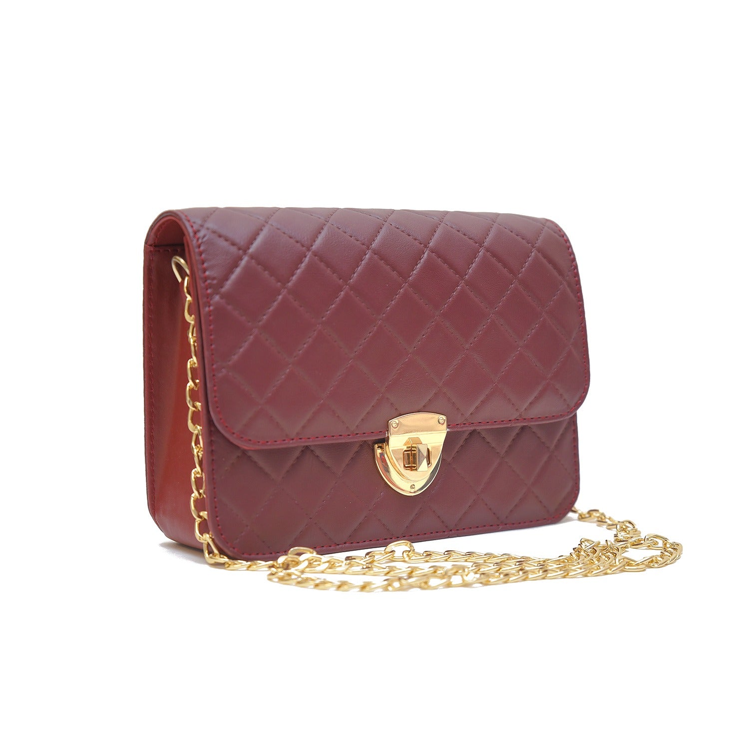 NORAH MEROON HANDBAG is a perfect blend of style and practicality. It's compact and easy to carry, making it ideal for a night out or special occasions. The golden chain adds a touch of elegance and can be worn as a shoulder bag or a crossbody for versatility. Its size is just right for your essentials like phone, wallet, and makeup. It's a fashion statement that complements your outfit and adds a touch of sophistication to your look."