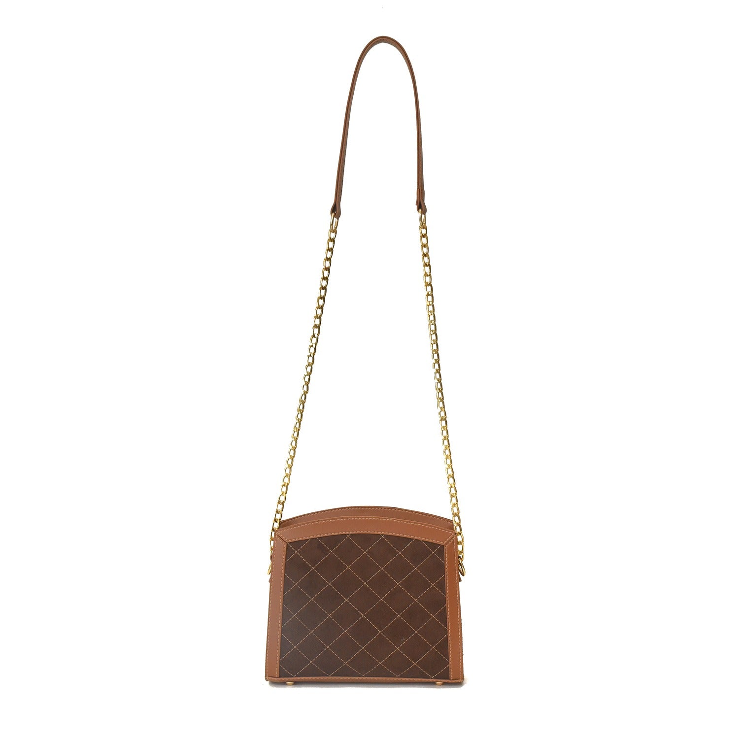 Sandy cross-body bag featuring a cross-stitch design, adorned with a luxurious golden chain. The intricate cross-stitch pattern adds a unique touch to the bag, while the golden chain enhances its elegance, making it a fashionable and versatile accessory for any occasion
